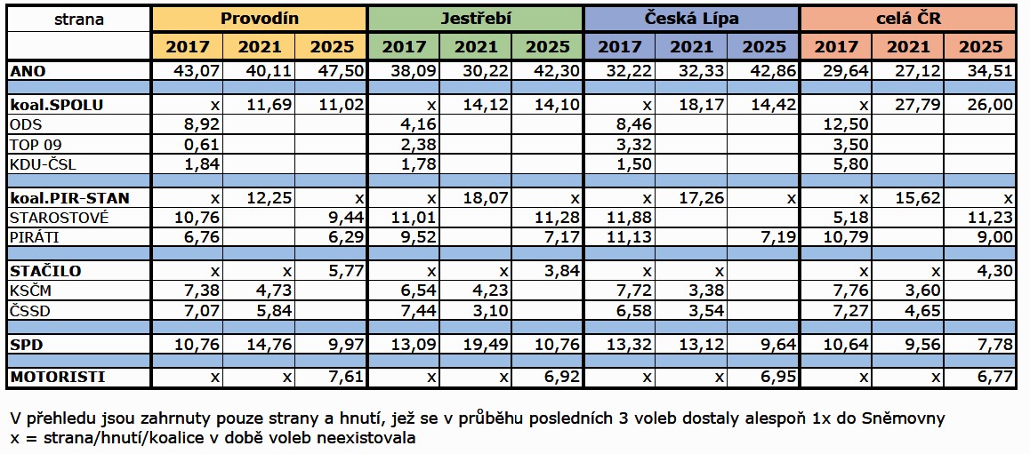 Tabulka níže uvádí, jak se vyvíjely volební preference během tří volebních období u nás, v nejbližší obci (Jestřebí), nejbližším větším městě (Česká Lípa) a celorepublikově. Pro lepší přehled jsem strany, které v některém období kandidovaly společně v koalici vizuálně seřadila k sobě.